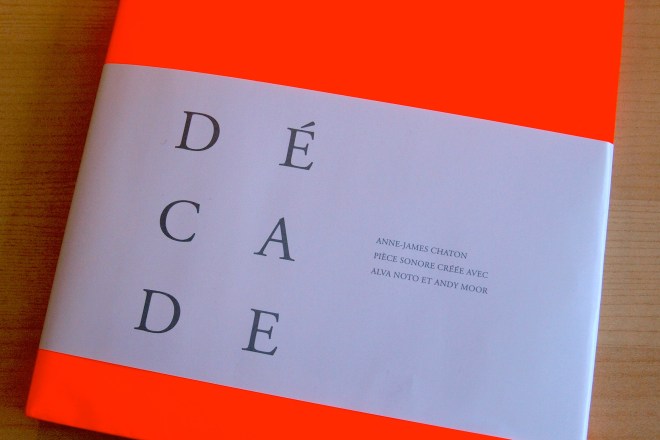 Décade is a book by Anne-James Chaton, accompanied by a CD of “pièce sonore créée avec Alva Noto et Andy Moor”. The book is attractively laid out, and the glitch and guitar effects of Noto and Moor make a suitably eerie accompaniment to Chaton’s vocal performance. In French, Spanish, German, Dutch, English, and Japanese (the latter five languages mainly distinguished by purple font in the book) we are presented with ephemera (application forms, bank statements, recipe ingredients, and the like) and simple sentences indicating times, locations, and activities. Representative selections follow: